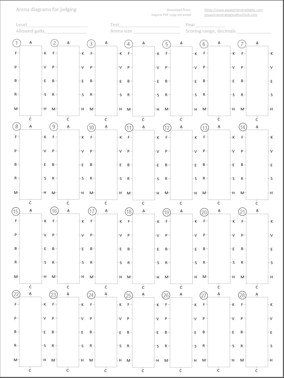 Download the blank template of dressage arena diagrams (20*60 m) to display and study your training or competition test blueprints (in a judge’s view).